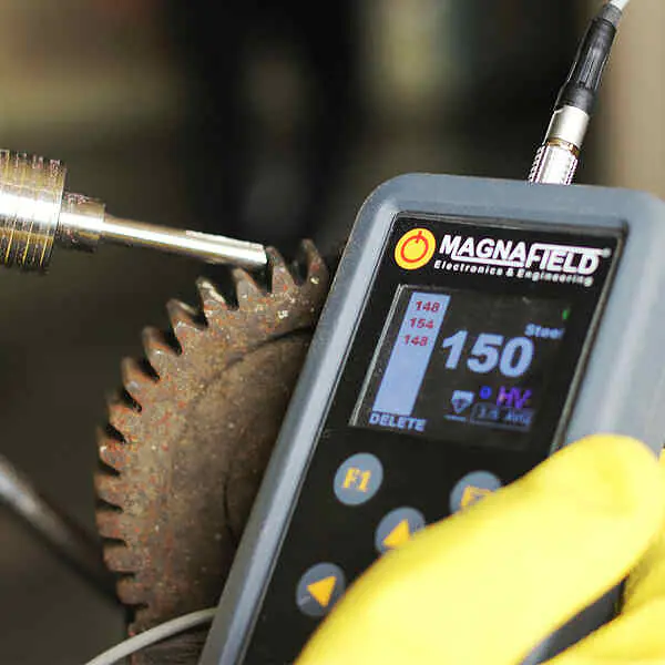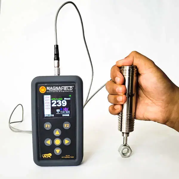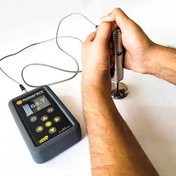 Meet the Magnafield’s UCI Hardness Tester, a versatile instrument for precise hardness measurements. With a large TFT color display, multiple measurement modes (HV, HRC, HB, HRB), unlimited testing angles, and the ability to save 150 data sets, it's the ideal choice for quality control. Compliant with ASTM A1038, easy to use, and backed by an 18-month warranty, this shockproof device is your go-to for accurate material analysis.